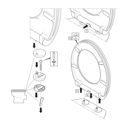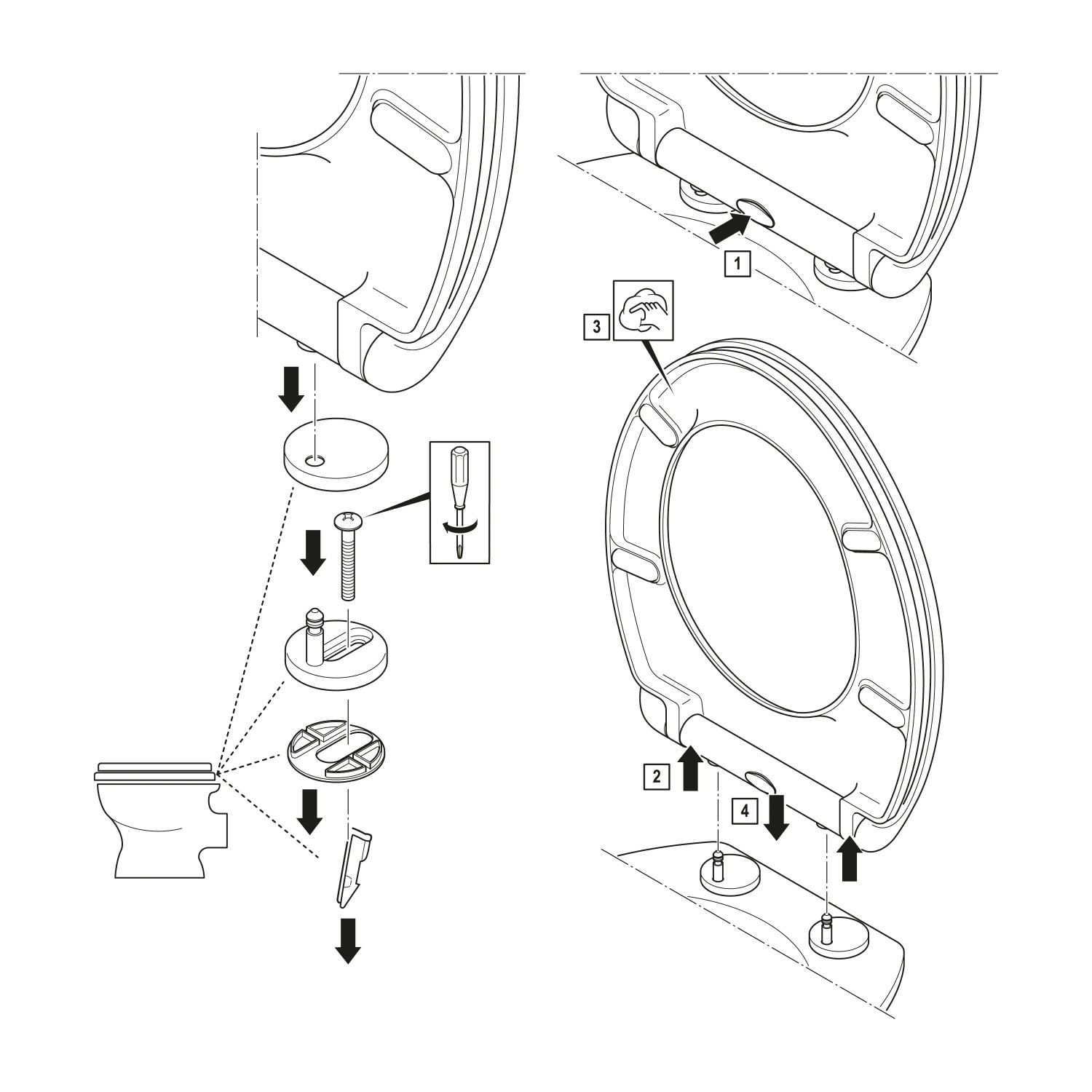 WC sedátko snadno připevníte pomocí závitových tyčí, které zasunete do určených držáků. Těsnění a šrouby potřebné k upevnění jsou součástí dodávky. Šrouby utáhnete pomocí šroubováku (není součástí balení, k dispozici samostatně).