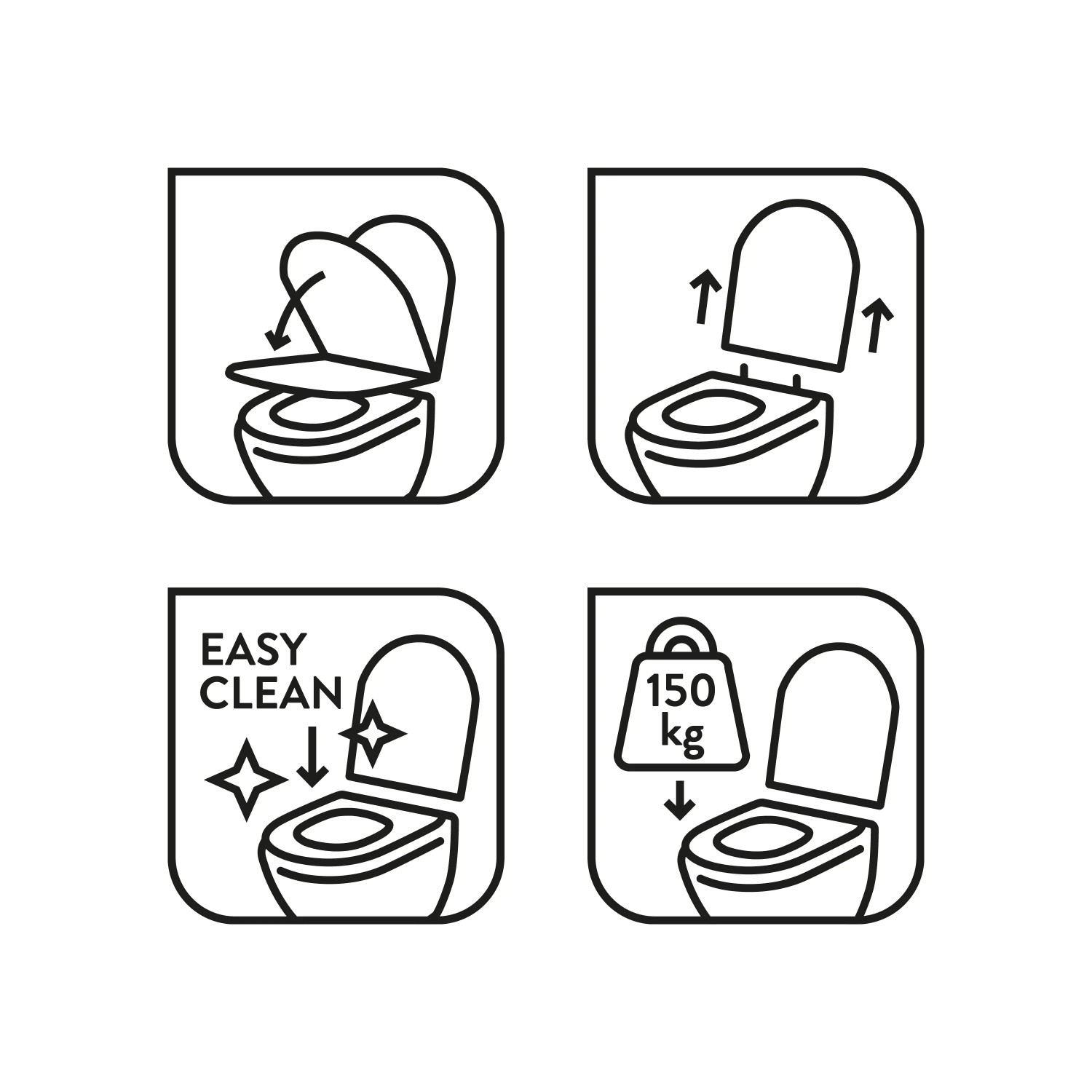 Aby záchodové prkénko a víko při sklápění nerachotily, jsou obě části vybaveny systémem pomalého zavírání (SoftClose). Robustní závěsy z nerezové oceli zajišťují bezpečné a trvalé spojení mezi oběma částmi.