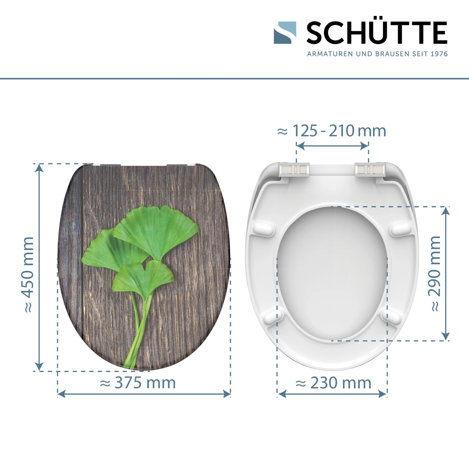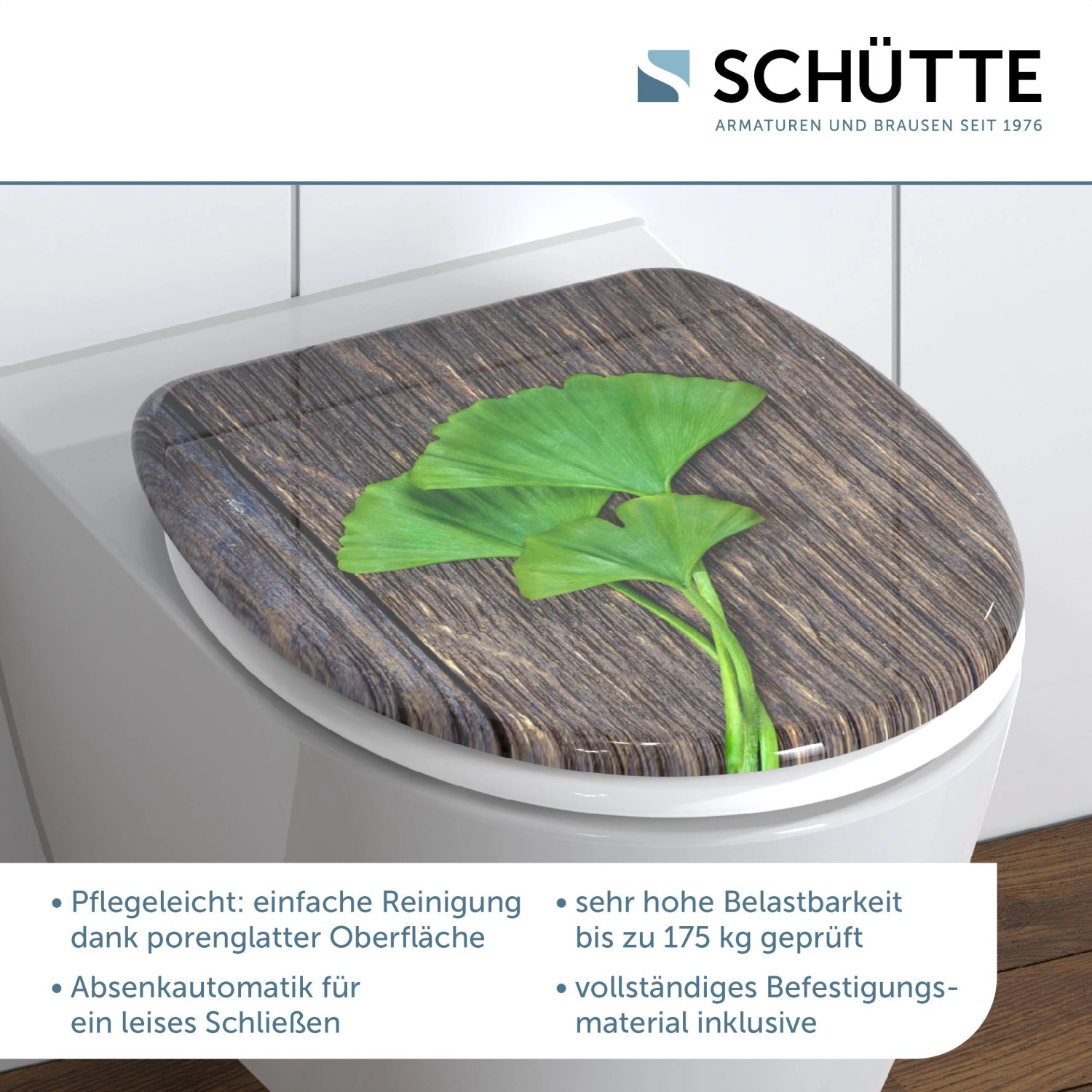 Kvalitní Eisl WC sedátko z duroplastu Ginko & Wood s automatickým sklápěním (poklop a sedátko se zavírají pozvolna a tiše) má standardní velikost a hodí se téměř na všechny běžné WC mísy. Díky materiálu duroplast s extrémně tvrdým povrchem je WC sedátko maximálně nerozbitné a odolné proti poškrábání. Hladký povrch umožňuje snadné a hygienické čištění. WC sedátko se upevňuje pomocí robustních závěsů. Eisl WC sedátko z duroplastu lze velmi snadno namontovat a dodává se připravené k montáži včetně montážního materiálu. Kromě toho disponuje nastavitelnou upevňovací technologií, která umožňuje variabilní montáž.