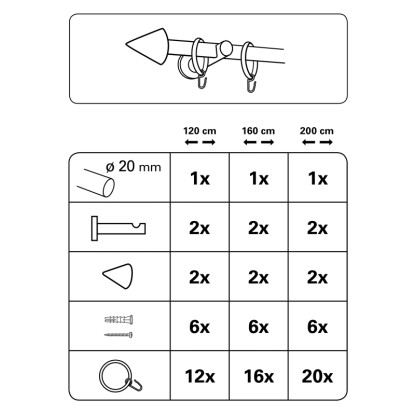 Kovová stylová souprava je k dispozici v různých délkách a barvách. Skládá se z jedné tyče o průměru 20 mm, 2 dekorativních koncovek a odpovídajících držáků.