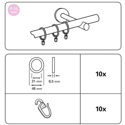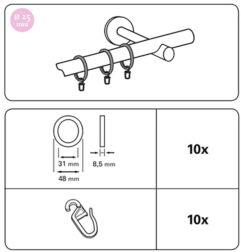 Kroužky mají vnitřní průměr 31 mm a vnější průměr 48 mm. S šířkou 8,5 mm nabízí stabilní a spolehlivé upevnění. Balení obsahuje 10 ks.