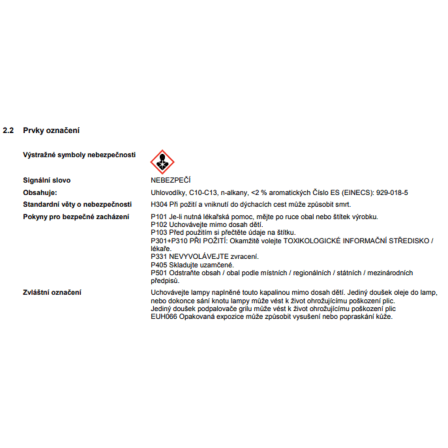 Olej do lampy 1 l hoří čistým a pěkným plamenem. Pro zamezení čazení je dobré udržovat co nejmenší knot a zajistit, aby byl knot dostatečně a zcela napuštěný. Ideální pro olejové lampy a pochodně, lze jej použít také do olejové lampy v interiéru. Olejové lampy, pochodně a olej do lampy se skladují mimo dosah dětí.