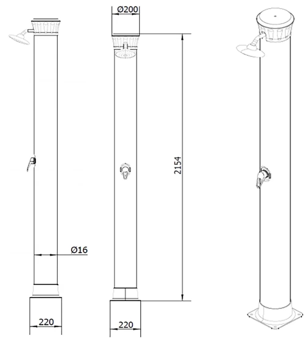 Tato solární zahradní sprcha je vhodným doplňkem všech typů rodinných bazénů, výhodným, levným a pohodlným zdrojem teplé užitkové vody u rekreačních objektů, v zahrádkářských koloniích, u malých sportovních zařízení a v zahradách rodinných domů. Sprcha se kotví pomocí 4 šroubů (nejsou součástí balení) pevně k zemi, čímž je zajištěna její perfektní stabilita.