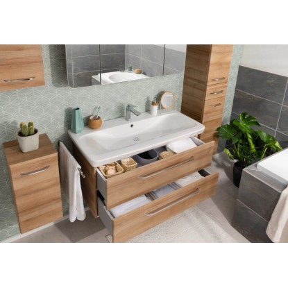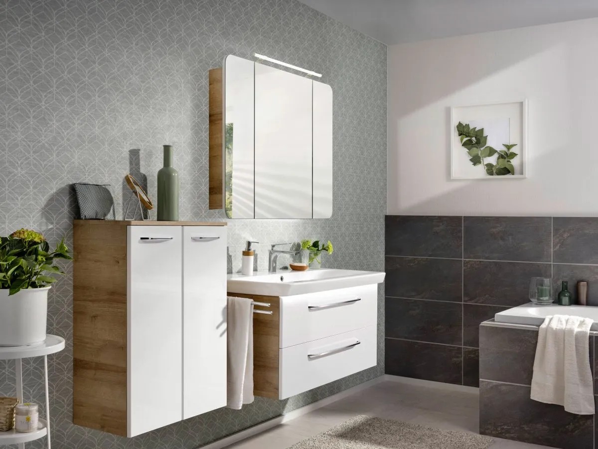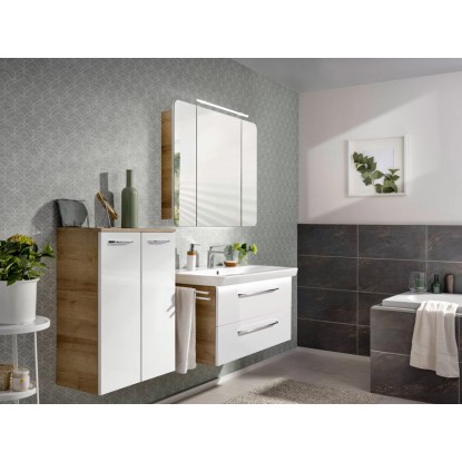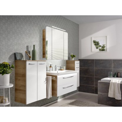 Série koupelnového nábytku FACKELMANN MILANO zaujme svým harmonickým, atraktivním a vkusným designem v příjemných a uklidňujících barvách. Koupelnový nábytek série MILANO je k dispozici ve 3 barevných provedeních - bílá ve vysokém lesku, sukatý dub a kombinace bílá ve vysokém lesku a sukatý dub. Korpusy skříněk mají matnou bílou barvu a příčky a zadní stěny mají stříbrnošedou barvu. Veškerý koupelnový nábytek série MILANO lze jednoduše kombinovat dle libosti mezi sebou. Kromě koupelnového nábytku v této série naleznete také umyvadla, doplňkové osvětlení a zrcadla.