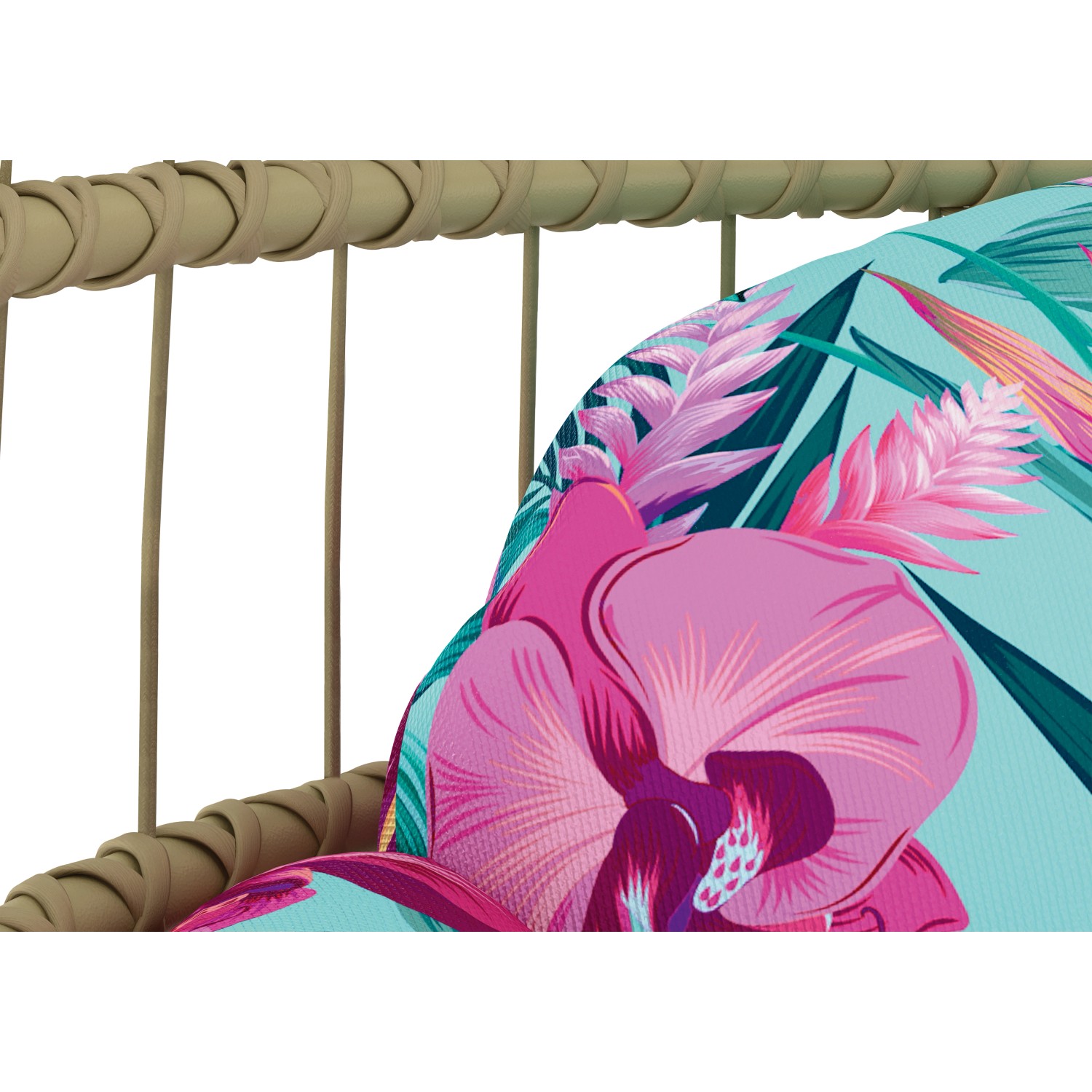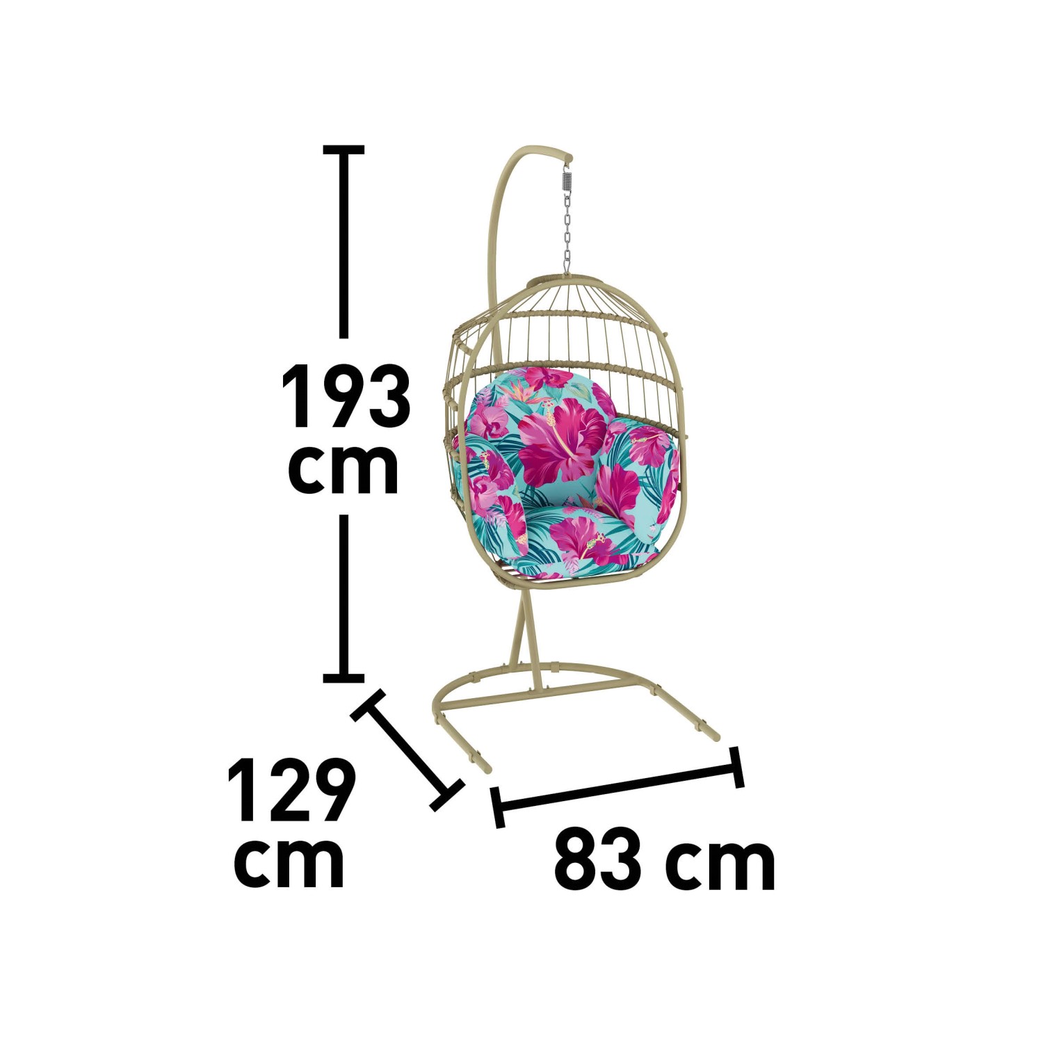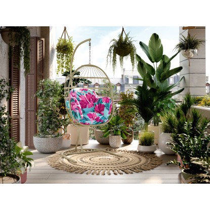 Závěsná houpačka je vybavena stabilní ocelovou konstrukcí s lakem zelené barvy. Vyznačuje se odolností vůči povětrnostním vlivům a dlouhou životností. Konstrukce je opatřena výpletem z robustního polyesteru, který je rovněž zelený a zajišťuje dobré odpružení. Vyjímatelné polstry na sedáky a opěradla poskytují vysoký komfort při sezení díky bohatému polstrování. Odolné potahy s květinovým vzorem jsou vyrobeny ze 100% polyesteru. Měkká výplň je vyrobena ze stejného materiálu.
