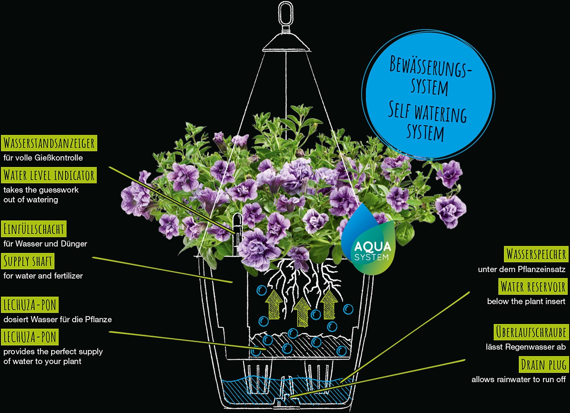 Je jedno zda jste pryč několik dní nebo přes den prostě nemáte čas na náročnou péči o rostliny. Květináče Lechuza zastanou práci za vás. Vaše rostliny jsou zabezpečeny na 2-12 týdnů, podle velikosti zásobníku a to zásobou vody i výživných látek, které potřebují k ideálnímu růstu. S doplněným zásobníkem se rostlina postará sama o sebe bez vašeho zásahu. Kdy je potřeba zásobník opět doplnit vodou a případně tekutým hnojivem, vám spolehlivě ukáže zabudovaná měrka stavu vody.