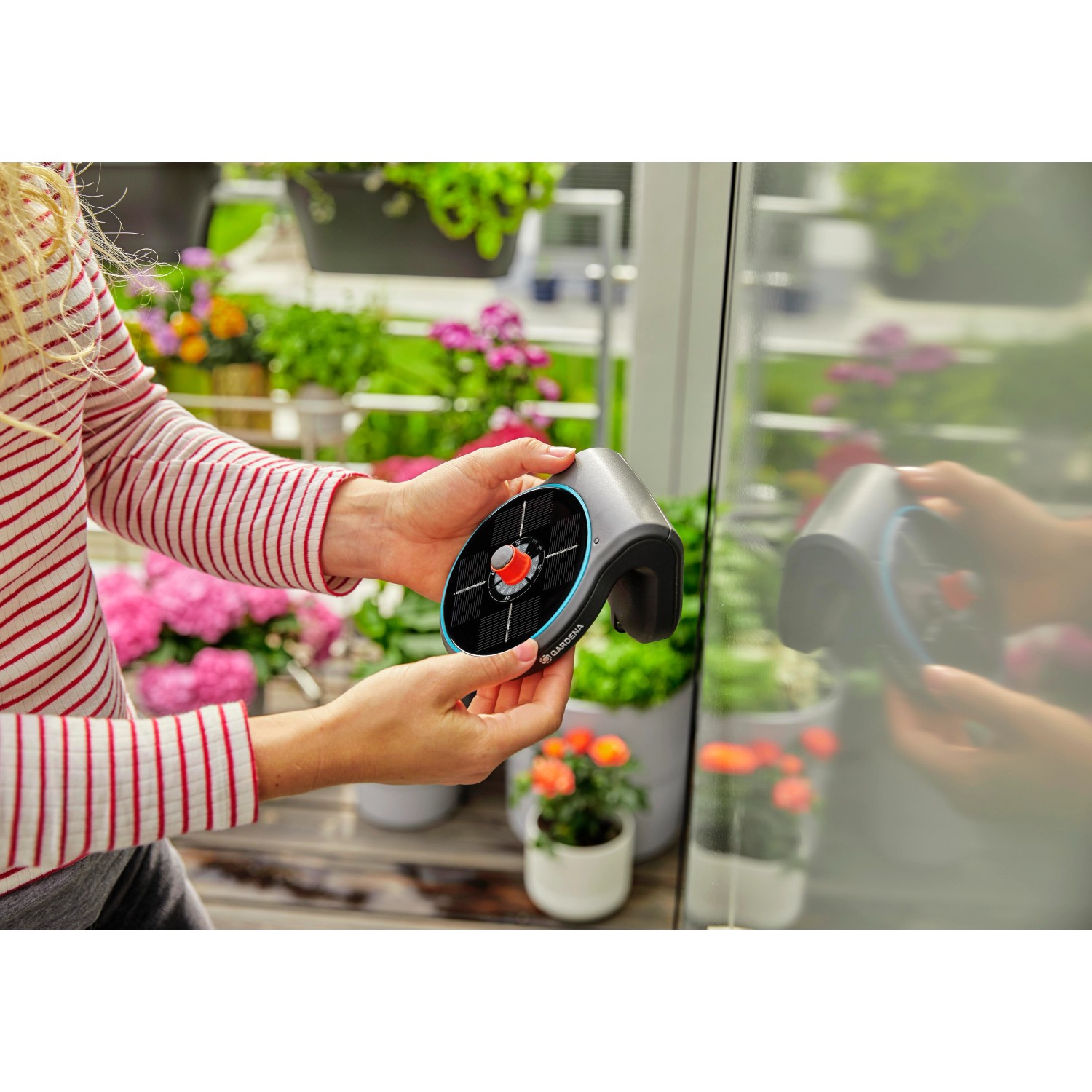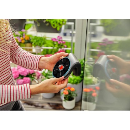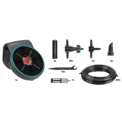 Péče o rostliny, když nejste doma. S Gardena solárním zavlažováním AquaBloom jsou vaše balkonové rostliny a rostliny v květináčích v dobrých rukou - po celou sezónu. AquaBloom zavlažuje a postará se o vaše rostliny i v době, kdy nejste poblíž. Užitečný systém nevyžaduje na vaší zahradě nebo terase ani vodovodní kohoutek, ani zdroj energie. Připraveni budete jenom s dodatečnou nádobou na vodu. Sada AquaBloom je kompletní zavlažovací systém připravený k použití, skládající se z hlavní jednotky 3 v 1. Je kombinací čerpadla pro čerpání vody, řídicí jednotky pro definování zavlažovacího plánu a solárního panelu, který napájí dodávané dobíjecí baterie. Neustálou kontrolu nad zavlažováním až pro 20 rostlin vám umožní 14 předdefinovaných zavlažovacích programů pomocí tlak vyrovnávajících kapačů. Každý kapač propustí až 300 ml. Nezapomeňte, že si můžete flexibilně zvolit nejvhodnější lokalitu pro umístění AquaBloom. Vyberte si slunné místo pro řídicí jednotku: zavěste ji na květináč, položte jej na stůl nebo připevněte na zeď. Instalace solárního zavlažování AquaBloom je jednoduchá a bez nářadí!