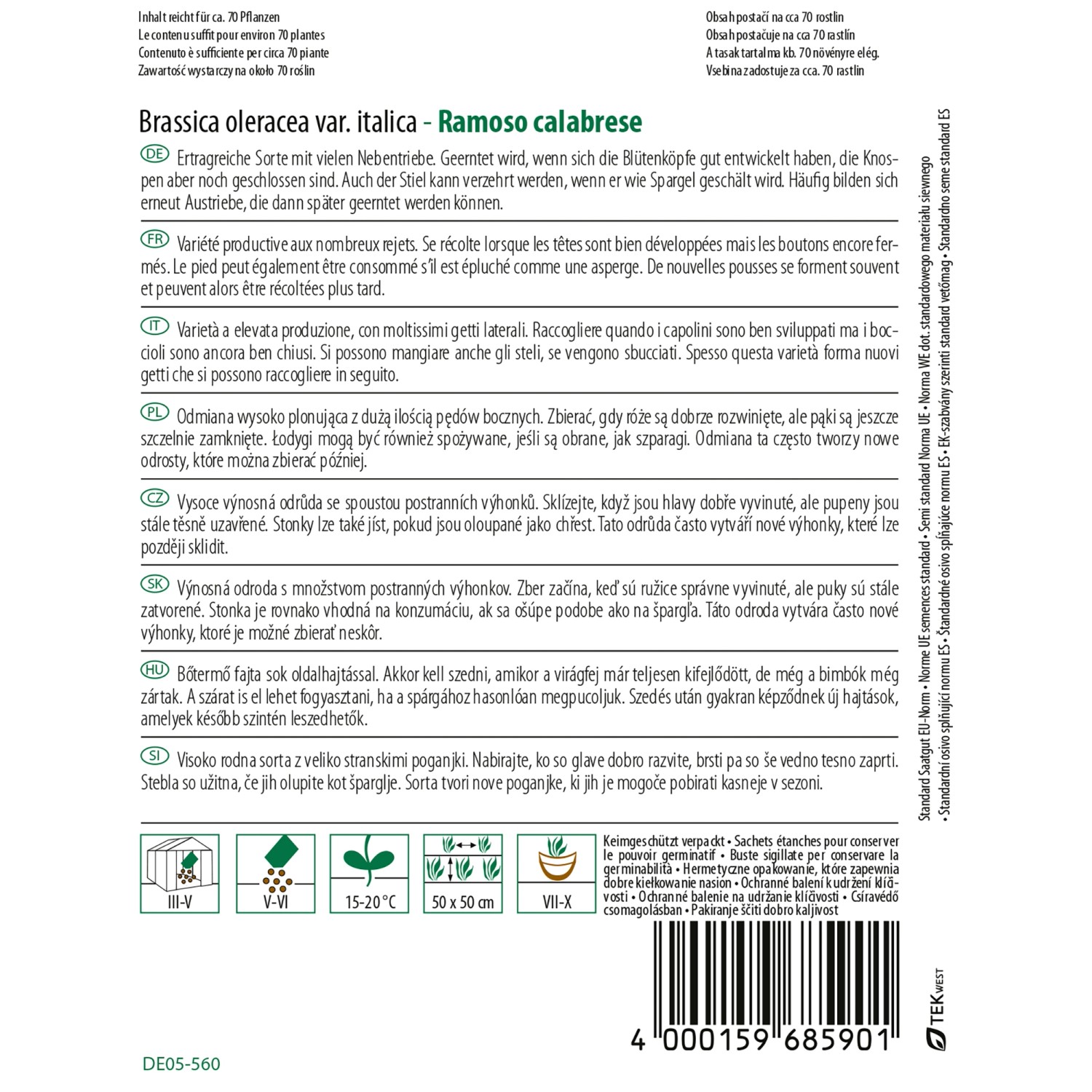 Pegasus brokolice Ramoso calabrese je vysoce výnosná odrůda se spoustou postranních výhonků. Sklízejte, když jsou hlavy dobře vyvinuté, ale pupeny jsou stále těsně uzavřené. Stonky lze také jíst, pokud jsou oloupané jako chřest. Tato odrůda často vytváří nové výhonky, které lze později sklidit. Standardní osivo dle norem EU. Balené s ochranou proti klíčení.