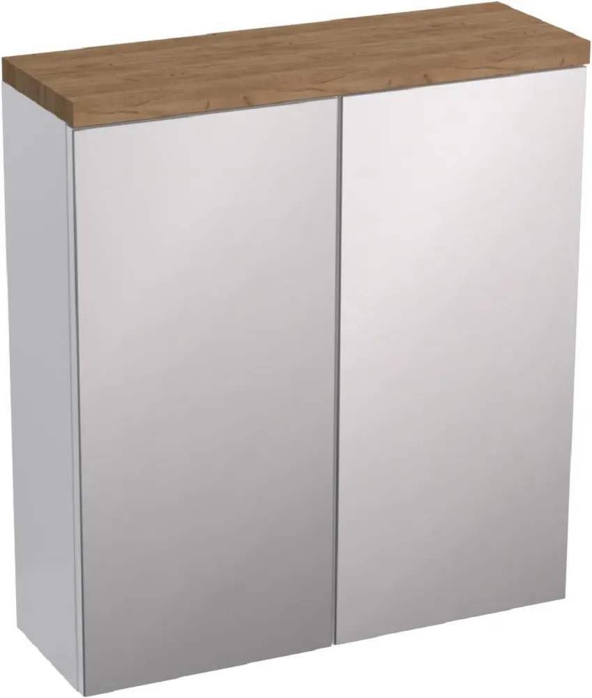 Zrcadlová skříňka v kombinaci bílých ploch a doplňků v dekoru Zlatý Dub. Korpus skříňky je vyroben z bílé nelakované 16 mm tlusté LTD desky v kombinaci s horní 25 mm tlustou LTD deskou v dekoru Zlatý Dub. Dvířka s tichým dovíráním jsou vyrobeny z LTD desky bílé barvy a je na nich nalepena zrcadlovina. Uvnitř skříňky je umístěna 1 výškově nastavitelná police ze skla. K zavěšení na stěnu je skříňka vybavena rektifikačními závěsy.