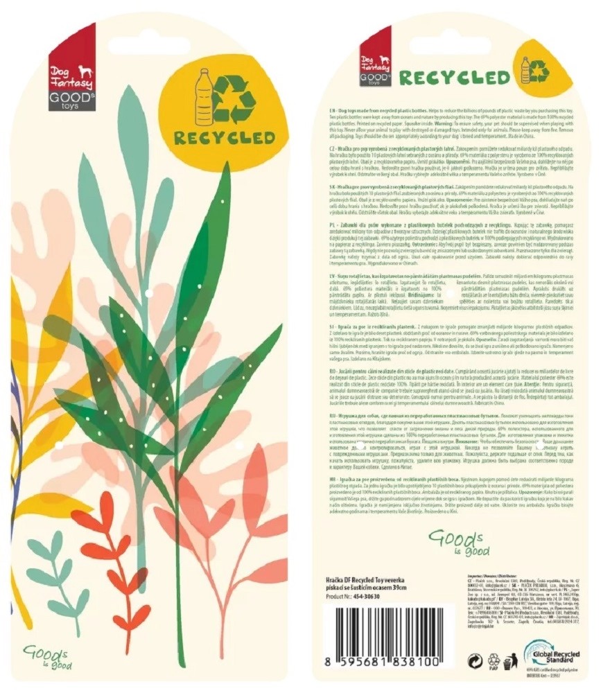 Dog Fantasy Recycled Toy se šustícím ocasem je vyrobena z 69% polyesteru získaného ze 100% recyklovaných plastových lahví, čímž pomáhá snižovat miliardy kil plastového odpadu, které končí v oceánech a v přírodě. Na výrobu této hračky bylo použito 10 plastových lahví, které byly sebrány a znovu využity. Dokonce i obal je z recyklovaného a recyklovatelného materiálu.